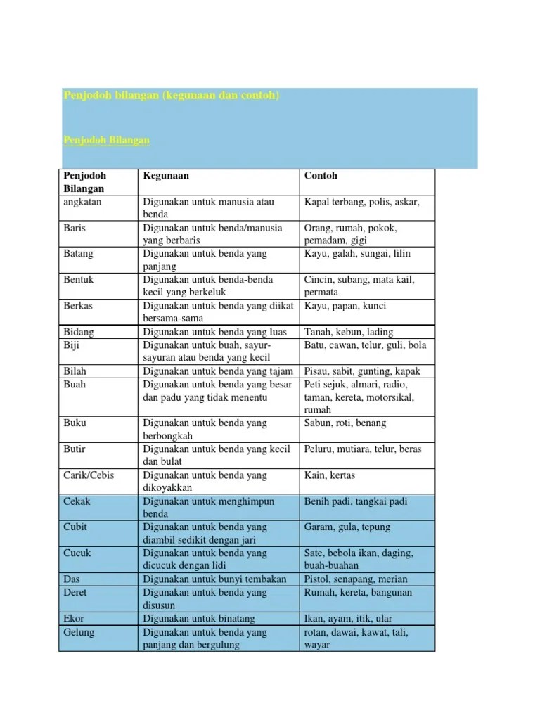 Penjodoh bilangan digunakan untuk menentukan sesuatu benda mengikut bentuk, rupa, saiz, dan juga sebagainya penjodoh bilangan untuk benang. Aug 18, 2022 · apakah yang dimaksudkan dengan penjodoh bilangan?